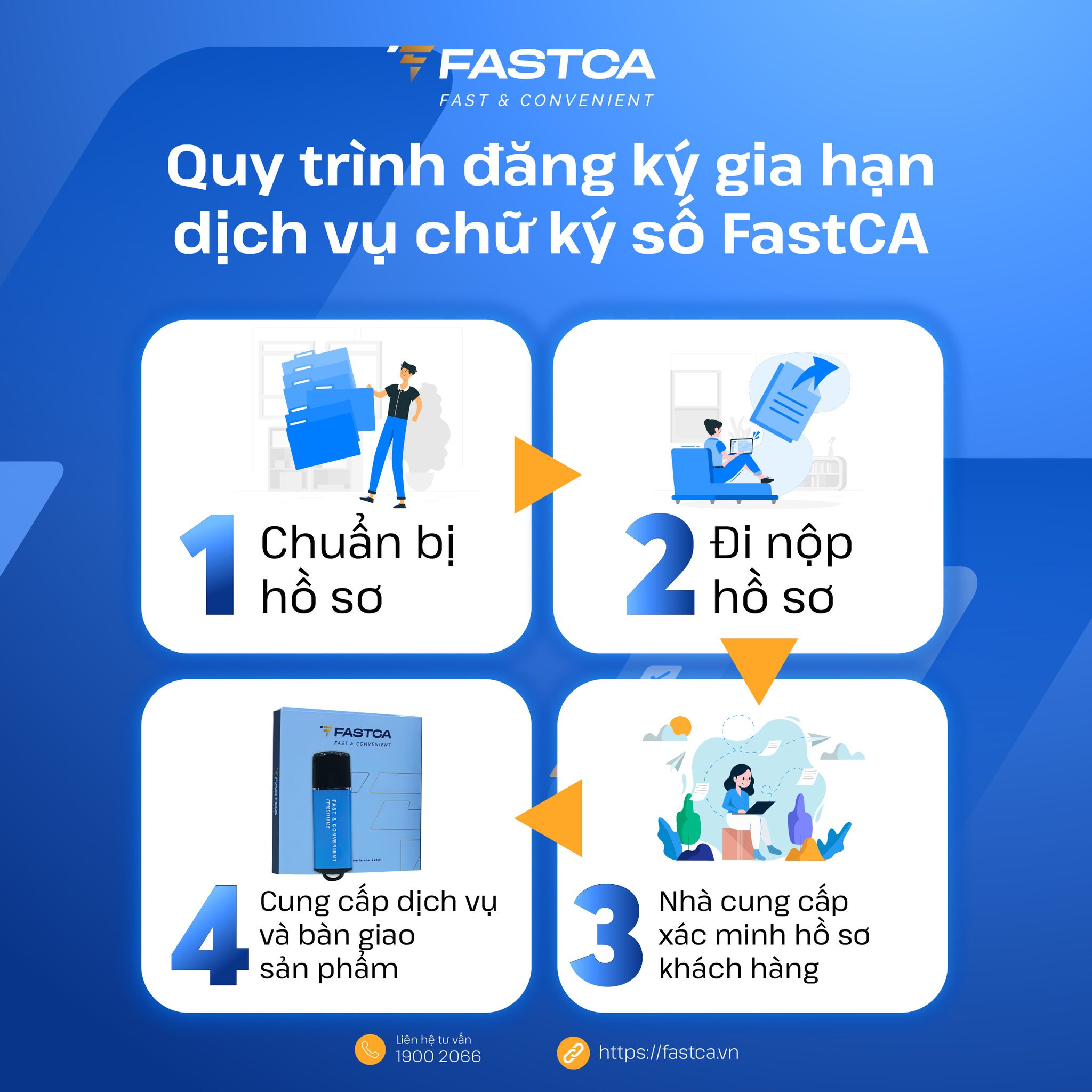 Dưới đây là quy Quy trình đăng ký gia hạn dịch vụ chứng thực chữ ký số công cộng FastCA dành cho khách hàng là tổ chức, doanh nghiệp và cá nhân: Bước 1: Chuẩn bị hồ sơ Khách hàng truy nhập vào website: https://fastca.vn hoặc liên hệ với các đại lý bán hàng của Nhà cung cấp để lấy mẫu biểu Giấy đăng ký gia hạn dịch vụ chứng thư số FASTCA Khách hàng điền đầy đủ thông tin và ký Giấy đăng ký gia hạn rồi nộp bản cứng hoặc bản điện tử. Bước 2: Nộp hồ sơ Khách hàng cần gửi nộp hồ sơ và thanh toán phí dịch vụ theo quy định. 1. Gửi hồ sơ 2. Thanh toán phí Bước 3: Nhà cung cấp xác minh hồ sơ khách hàng Nhà cung cấp kiểm tra, xác minh tính hợp lệ của hồ sơ đăng ký và phản hồi quyết định gia hạn chứng thư số cho khách hàng trong vòng 02 giờ làm việc hành chính. Trường hợp hồ sơ chưa đầy đủ, Nhà cung cấp sẽ thông báo để khách hàng bổ sung, hoàn thiện. Bước 4: Cung cấp dịch vụ và bàn giao sản phẩm 1. Nếu hồ sơ hợp lệ, Nhà cung cấp sẽ tiến hành gửi tài khoản gia hạn dịch vụ chứng thực chữ ký số công cộng FASTCA cho khách hàng. 2. Khách hàng tiếp nhận bàn giao, nghiệm thu sản phẩm.