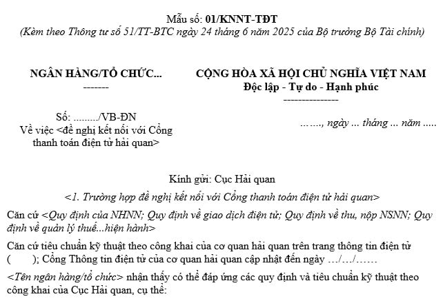 Theo quy định tại Thông tư 51, bắt đầu từ ngày 07/08/2025, doanh nghiệp, tổ chức có nhu cầu kết nối hệ thống thanh toán với Cổng thanh toán điện tử của Tổng cục Hải quan cần sử dụng đúng Mẫu 01 KNNT TĐT trong hồ sơ đề nghị.
