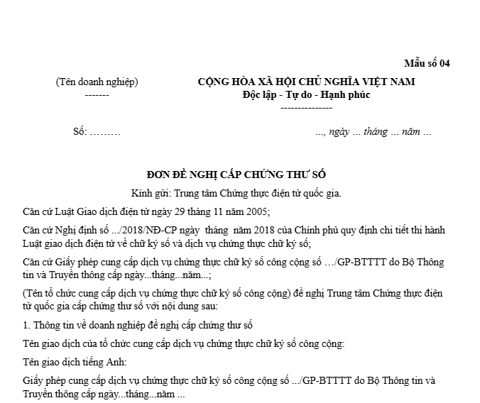 Đơn đề nghị Tổ chức cung cấp dịch vụ chứng thực chữ ký số quốc gia cấp chứng thư số theo Mẫu số 04 tại Phụ lục ban hành kèm theo Nghị định này.